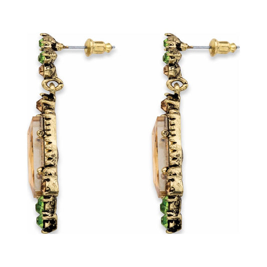 Baguette-Cut Champagne and round Green Faceted Crystal Vintage-Style Drop Earrings in Antiqued Goldtone 2"