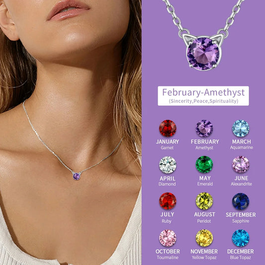925 Sterling Silver Cat Necklace Girls Cute Cat Jewelry round Amethyst Pendant Necklace February Birthstone for Cat Lovers