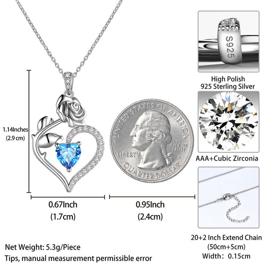 925 Sterling Silver Birthstone Necklace for Women,Rose Flower Heart Pendant Necklace Jewelry Gifts