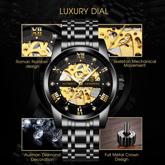 Automatic Watches for Men, Diamond Skeleton Self Winding Luxury Dress Mens Watches Sapphire Crystal Tungsten Steel Band Luminous Waterproof Reloj, Gifts for Men