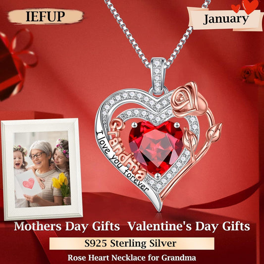 Gifts for Grandma Necklace - S925 Sterling Silver Rose Flower Birthstone Necklac